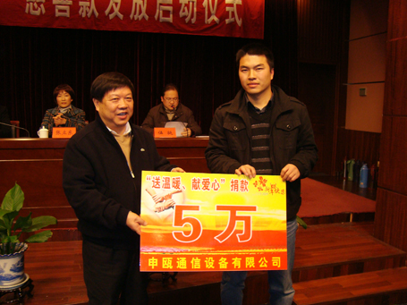 2009年1月14日上午,鹿城區2009年“送溫暖、獻愛心”慈善款發放啟動儀式在區行政中心會議室隆重舉行,參加會議的有區四套班子主要領導、各街道部分生活貧困人員及區相關企業負責人。會議主要就2009年“送溫暖、獻愛心”活動作了相關部署。我公司辦公室主任萬謙勇代表企業向貧困人員損獻5萬元的愛心款,並希望他們能過個安定、祥和年。