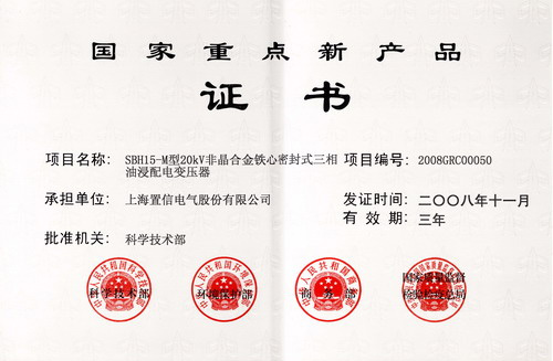 經國家科技部批準,置信電氣股份有限公司的SBH15-M型20KV非晶合金鐵心密封式三相油浸配電變壓器獲得由國家科技部、環境保護部、商務部、國家質量監督檢驗檢疫總局頒發的“國家重點新產品”證書。