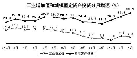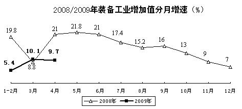 1-4月,規模以上工業增加值同比增長5.5%,其中一季度增長5.1%,是過去15年來季度最低增長水平。從月度運行情況看,前兩個月增長3.8%,處於去年下半年以來下滑的最低點;3、4兩個月增速分別回升到8.3%和7.3%,均高於去年11、12月增長水平。前四個月運行情況表明,中央一係列“擴內需、保增長”的政策措施已初見成效,工業經濟呈現出止跌回升的積極變化。