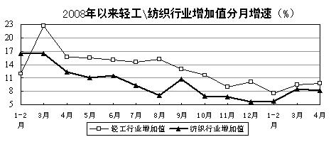 輕工、紡織行業運行態勢較為平穩。在國際市場萎縮、出口受阻的不利形勢下,輕工、紡織行業立足國內市場,整體運行保持穩定回升的良好態勢。4月份,輕工行業增加值同比增長9.8%,比3月份又加快0.4個百分點,其中農副食品加工、食品製造和飲料製造當月增速達到13.2%-19.2%。3、4兩個月,紡織行業增速均超過8%,並高於去年四季度各月水平,其中服裝及鞋帽製造達到10%的增長水平。
