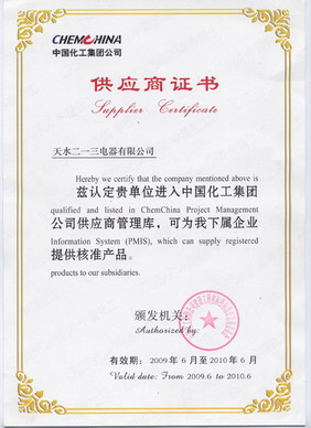 中(zhong)國(guo)化(hua)工(gong)集(ji)團(tuan)公(gong)司(si)經(jing)過(guo)近(jin)三(san)個(ge)月(yue)對(dui)我(wo)公(gong)司(si)申(shen)報(bao)相(xiang)關(guan)資(zi)料(liao)的(de)嚴(yan)格(ge)審(shen)查(zha),通(tong)過(guo)了(le)該(gai)集(ji)團(tuan)公(gong)司(si)規(gui)劃(hua)部(bu)供(gong)應(ying)商(shang)初(chu)審(shen),經(jing)該(gai)集(ji)團(tuan)監(jian)事(shi)部(bu)審(shen)核(he)合(he)格(ge),於(yu)2009年6月25日為我公司頒發了《供應商證書》,我公司正式成為了中國化工集團的合格供應商。