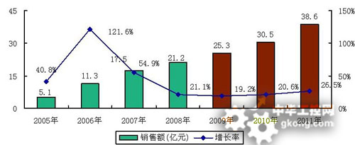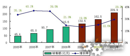 2008年,中國MEMS市場增速大幅回落。然而,作為半導體領域最為前沿的產品領域之一,未來,MEMS新型顯示器、MEMS電池等各種新產品以及MEMS陀tuo螺luo儀yi汽qi車che盲mang區qu導dao航hang等deng各ge種zhong新xin型xing應ying用yong的de不bu斷duan湧yong現xian將jiang成cheng為wei這zhe一yi市shi場chang快kuai速su回hui暖nuan的de重zhong要yao砝fa碼ma。此ci外wai,為wei進jin一yi步bu增zeng強qiang市shi場chang抗kang風feng險xian能neng力li,不bu少shao廠chang商shang也ye正zheng加jia快kuai從cong單dan一yiMEMS器件生產商向價格及利潤較高的MEMS模塊供應商升級的步伐,這也將有利於MEMS整體市場規模的擴大。與此同時,在生產技術上,隨著MEMS與CMOS(互補金屬氧化物半導體)工藝的進一步融合以及台積電、聯電等大型代工企業對MEMS工藝開發的進入,MEMS新產品的實現以及成本的進一步降低也將得到技術保障。預計從2010年開始,在中國MEMS市場將開始強勢回暖,市場增速亦將快速提高。到2011年,中國MEMS市場增速將達29.2%,超過2008年發展水平,從而重新回到快速軌道中。