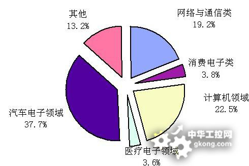 在汽車電子領域,近幾年,在中國汽車電子產業快速發展的推動下,MEMS壓力計、MEMS加速度計以及化學傳感器等產品用量得到快速提高,同時,由於汽車領域中MEMS產品較3C領域內同類產品平均單價高,這一應用領域市場規模也因此較大。2008年,汽車電子領域 MEMS實現銷售額41.7億元,市場份額達37.7%。值得注意的是,中國汽車電子領域已成為中國MEMS最大應用市場。