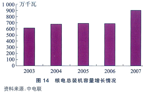 根據2020年中國GDP翻兩番的發展目標估計,國內約需發電裝機容量10億-14億千瓦,而到2008年已有裝機容量僅為8億千瓦,占全國電力總裝機僅1.27%,同法國的75%、美國的27%還有很大差距(見表三)。在鄰國日本,核能已經是準自給能源,日本核能發電能力儲備達半年之久,而中國目前隻有數日。在未來十幾年間,將新開工建設40台以上的百萬千瓦級核電機組,運行核電總規模相當於20個大亞灣核電站。