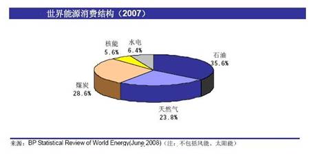 在經曆過三次石油危機衝擊後,水力、核能、風能、太陽能等新能源也不斷被人類所利用。目前,世界能源形成了以石油、天然氣、煤炭為主,水力、核能、風能、太陽能為輔的能源消費格局。2007年全球能源消費結構(見圖1、表1)中,石油平均占35.6%(比2006年35.8%下降0.2%)、天然氣平均占25.6%(比2006年23.7%上升1.9%),煤炭平均占28.6%(比2006年28.4%上升0.2%),核能平均占5.6%,水力平均占6.4%。目前—次不可再生能源石油、煤炭和天然氣共占能源消費的80%以上,仍然在能源格局中處於主體地位。
