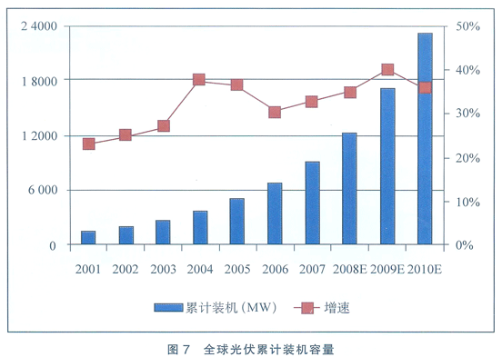 2007年全球光伏組件及係統新增裝機容量2249MWp,同比增速達40.74%,全球累計光伏組件裝機容量(見圖7)為9100MWp,同比增速為32.83%,2000~2007年間,全球光伏累計裝機容量年複合增長率達到30.83%,全球光伏業產值達172億美元,增長態勢迅猛。
