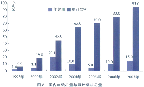 2007年,我國光伏發電設備新增裝機容量26MW,僅比上年增長16MW,較低的基數反映在數字上卻是驚人的160%的增長,累計光伏裝機容量為106MW,同比增長32.5%,與全球裝機容量的平均增速持平,但隻占全球總裝機容量的1.16%。然而,我國光伏實際產能僅次於日本和德國,居全球第三,90%以上的光伏電池組件和係統銷往國外,我國的光伏產業己出現了典型的產業與市場倒掛現象。國內年裝機量與累計裝機總量見圖8。