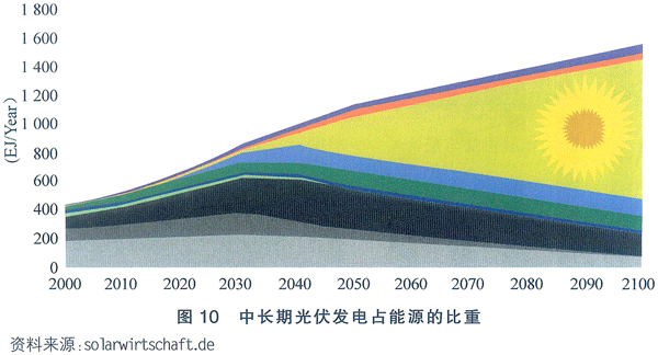 據世界能源組織(IEA)、歐洲聯合研究中心、歐洲光伏工業協會預測,2020年世界光伏發電將占總電力的1%,到2040年光伏發電將占全球發電量的20%,按此推算未來數十年,全球光伏產業的增長率將高達25%-30%。中長期光伏發電占能源的比重見圖10。