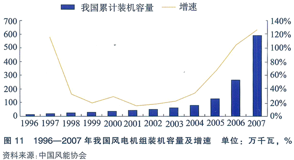 根據中國風能協會提供的統計數據,截止2007年底,我國(台灣地區除外)新增風電機組3155台,新增裝機容量達330.4萬KW,同比增長147.1%;2007年底累計風電機組6469台,裝機容量達590.6萬KW,風電場158個,分布於21個省(市、區和特別行政區),較2006年增加了6個省市(北京、山西、河南、湖南和湖北),累計裝機容量同比增長127.2%,2007年共計上網電量約52億KWH。這些數字遠遠超出先前預期。 1996—2007年我國風電機組裝機容量及增速見圖11。