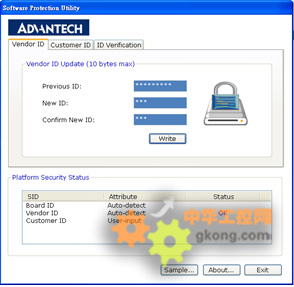 研華嵌入式核心服務開發的軟件保護工具(Software Protection utility)可為客戶提供堅固的安全保護功能,從而將客戶的應用數據更安全地保護在嵌入式BIOS中。在BIOS內共設有3種安全ID功能,分別為Board ID、Vendor ID和Customer ID。Security ID是由客戶定義的獨特字符串,並且使用了哈希函數SHA-1進行加密。通過調用研華API,係統集成商的嵌入式應用即可訪問Security ID。如果Security ID不正確,應用在停止執行的同時,也將根據客戶的應用設置通過網絡發送信息確認進一步需要執行的動作。因此,安全得到了保障。