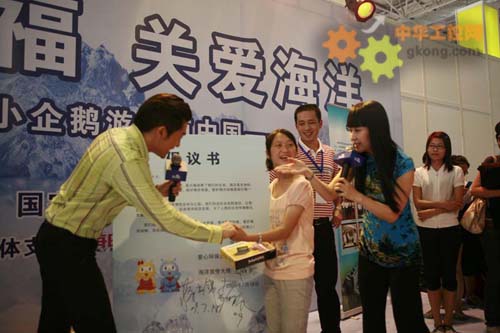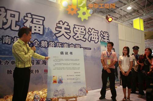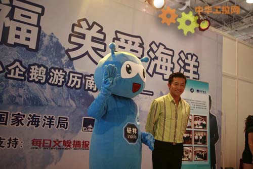 作為首屆海洋博覽會,今年的展會主要突出展現了建國60年來中國海洋事業的進步和成就;同時也融入了更多的公益元素。主辦方特意通過南極科考隊帶回來了兩隻漂亮的王企鵝,作為本次會議的“重要嘉賓”參(can)展(zhan),王(wang)企(qi)鵝(e)作(zuo)為(wei)南(nan)極(ji)大(da)陸(lu)最(zui)漂(piao)亮(liang)的(de)企(qi)鵝(e)當(dang)即(ji)吸(xi)引(yin)了(le)眾(zhong)多(duo)觀(guan)眾(zhong)的(de)駐(zhu)足(zu)圍(wei)觀(guan)。未(wei)來(lai)幾(ji)天(tian),這(zhe)兩(liang)隻(zhi)南(nan)極(ji)貴(gui)賓(bin)將(jiang)客(ke)居(ju)珠(zhu)海(hai),和(he)珠(zhu)海(hai)市(shi)民(min)親(qin)切(qie)互(hu)動(dong)。主(zhu)辦(ban)方(fang)提(ti)醒(xing)市(shi)民(min),由(you)於(yu)南(nan)極(ji)企(qi)鵝(e)怕(pa)驚(jing)嚇(xia),市(shi)民(min)參(can)觀(guan)時(shi),請(qing)切(qie)勿(wu)使(shi)用(yong)閃(shan)光(guang)燈(deng)拍(pai)照(zhao),切(qie)勿(wu)喧(xuan)嘩(hua),切(qie)勿(wu)用(yong)手(shou)拍(pai)打(da)玻(bo)璃(li)冰(bing)櫃(gui)。而(er)同(tong)樣(yang)吸(xi)引(yin)眼(yan)球(qiu)的(de)是(shi)與(yu)企(qi)鵝(e)同(tong)在(zai)一(yi)個(ge)展(zhan)區(qu)的(de)另(ling)外(wai)兩(liang)位(wei)來(lai)賓(bin),來(lai)自(zi)台(tai)灣(wan)的(de)當(dang)紅(hong)藝(yi)人(ren)蘇(su)有(you)朋(peng)將(jiang)以(yi)“海洋宣傳大使”的身份和一名來自四川地震災區的小女孩張丹組建成一個“愛心家庭”,來共同認養兩隻小企鵝。隨後蘇有朋和研祥集團還為張丹贈送了禮品。