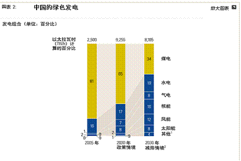 隨著製造商不斷提高太陽能和風力發電設備的產量,實施這些技術的成本將會下降。到2030年,在中國的能源中,太陽能將占到8%的比例,而風能將占到12%(而目前這兩種能源所占比例微乎其微),核電在電力所占比例將從2%提高到16%,水力發電將從16%提高到19%,而天然氣發電也將從1%提高到8%(圖表2)。