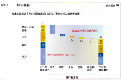 為wei了le充chong分fen實shi現xian這zhe些xie技ji術shu的de潛qian力li,中zhong國guo需xu要yao從cong現xian在zai就jiu開kai始shi行xing動dong。等deng待dai數shu年nian,就jiu可ke能neng降jiang低di提ti高gao能neng效xiao和he減jian排pai的de可ke能neng性xing。比bi如ru,為wei了le充chong分fen發fa揮hui電dian力li行xing業ye的de減jian排pai潛qian力li,中zhong國guo必bi須xu在zai2010nianqianshishiwomensuojianyidedabufencuoshi。zhongguozhengzaibuduanjianshexindehuolifadianchang,ruguobuduizhexiedianchangcaiyongangguidetanbuhuojishujinxinggaizao,tamenjiangzaiweilai30年~40年間不斷排放溫室氣體。一項簡單的靈敏度分析顯示,更清潔的發電技術的實施如果推遲5年,累計效應到2030年,溫室氣體的減排潛力就可能降低達15億噸——超出了該技術可能減排能力的50%(圖表3)。如果推遲10年,則可能使減排潛力喪失80%。