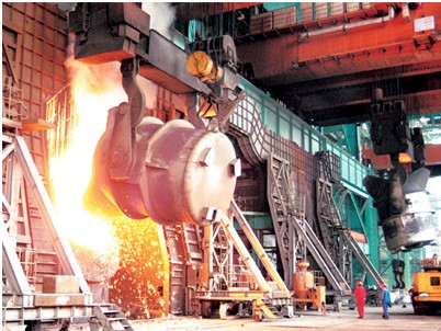 寶鋼兼並新疆八一鋼鐵集團之後鋼產量居行業第一位。圖為寶鋼八一鋼鐵公司轉爐煉鋼車間。