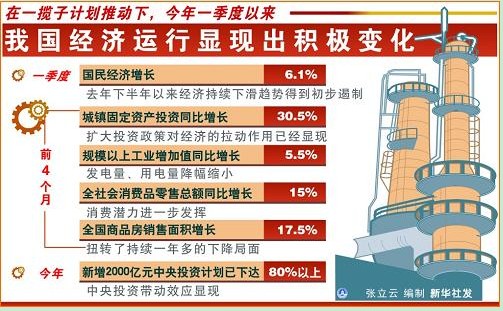 ——一季度國民經濟增長6.1%,去年下半年以來經濟持續下滑趨勢得到初步遏製;
