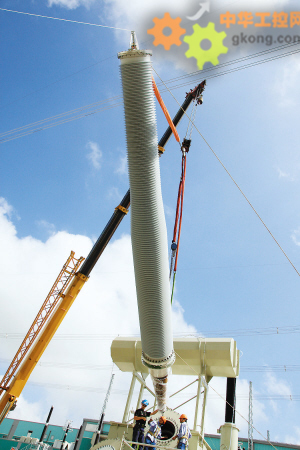 圖為施工人員正在吊裝800千伏換流變壓器高壓套管。