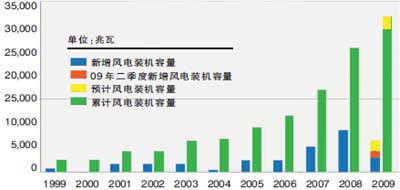 據美國風能協會(AWEA)2009年第二季度市場報告顯示,該季度美國新安裝的風力發電機總裝機容量達到1210兆瓦。到目前為止,美國風能發電量達到4000兆瓦,雖然大大低於第一季度的2860兆瓦,但這意味著今年上半年美國新安裝的風電機組總裝機容量已經超過2008年nian全quan年nian創chuang下xia的de曆li史shi最zui高gao水shui平ping。美mei國guo風feng能neng市shi場chang近jin年nian來lai的de迅xun猛meng發fa展zhan體ti現xian出chu美mei國guo對dui清qing潔jie能neng源yuan的de關guan注zhu,然ran而er其qi良liang好hao的de發fa展zhan勢shi頭tou中zhong也ye包bao含han著zhe業ye內nei人ren士shi對dui其qi的de擔dan憂you。