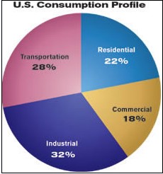 2008年美國能源消耗分布圖,半數的能源消耗來自工業和商業領域。