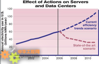 2006年,位於美國的服務器和數據中心耗電量相對於2001年將增加一倍,如果我們不采取相關措施,未來五年內耗電量還將提高一倍。隨著技術的進步,我們能將耗電量減少50%,即使需求量還將增加一倍。
