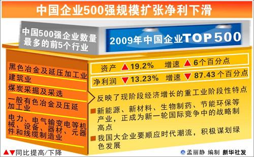 報告顯示,中國500強企業正在持續成長,但速度有所減緩。2009年中國500強企業營業收入為26萬億元,比上年增長19.7%,但增速比上年減少了約5個百分點;資產總額達到74.2萬億元,比上年提高19.2%;“500強”的入圍門檻上升到105億,比2008年時的93億增加了13%,首次突破百億大關,但增速同比下降了約15個百分點。