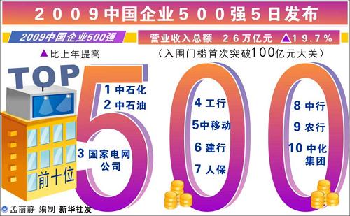 在此次主題為“危機下的大企業發展:變革與展望”論壇中,中國企業聯合會、中國企業家協會會長王忠禹發布了中國企業500強及其分析報告。中國石油化工集團、中國石油天然氣集團公司、國家電網公司分別名列三甲,雙星集團有限責任公司以105億元人民幣的營業收入排在第500位。