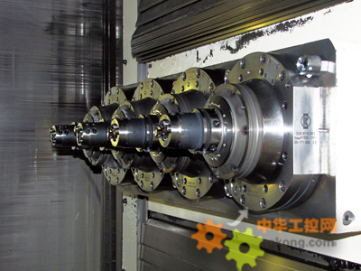 該四主軸加工中心采用單主軸箱,四主軸同向單排水平排列,聯動控製。四主軸同步運動,可同時對四個連杆進行相同內容的加工。