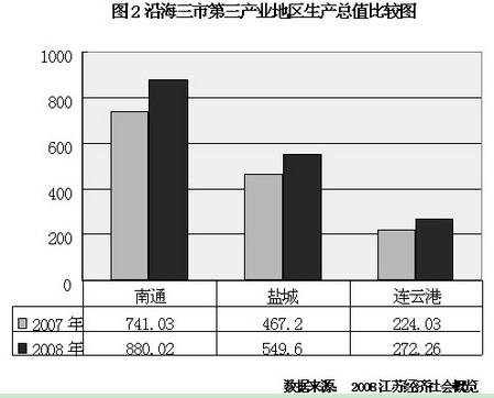 suizhejiangsuyanhaidiqushengchanlishuipingdetigaohejingjishehuidefazhan,sancichanyeneibujiegouyifashenglejijidebianhua。anzhaochanyejingjixuedelilun,diyichanyezhongzhongzhiyedebizhonghuixiajiang,chumuye、林果業和水產業比重會上升,第二產業中資本密集、技術密集型產業比重會上升,其他產業比重會下降,第三產業中傳統服務業比重會下降,非傳統服務業比重會上升。以2008年為例,沿海地區第一產業增幅最大是肉類和水產類,大約分別在8.97%和3.6%。第二產業中新興製造業發展快速,連雲港市全年規模以上高新技術工業產值達到200.80億元,同比增長40.7%;鹽城市先進製造業得到快速發展,東風悅達起亞汽車下線139067輛,同比增長31.3%,通用設備製造業實現銷售收入336.6億元,同比增長40.38%;南通市生產民用鋼質船舶161.27萬總噸和307.83萬載重噸,分別比上年增加57.0%和37.1%,大規模集成電路47.78億塊,比上年增長22.4%。第三產業中傳統服務業實現地區生產總值占40.97%,而非傳統服務業實現地區生產總值占59.03%。江蘇沿海地區產業內部結構所發生的變化,符合三次產業內部結構變化的一般規律,產業發展步入快車道。
