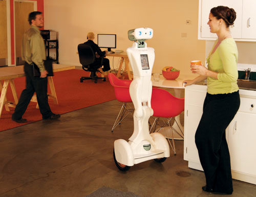 Trevor Blackwell的Anybots公司新進研發了一款名為QA的辦公室替身機器人。它承襲了人體的雛形,頂著一個如ETwaixingrensidedanaodai,yanjingshiwuxianshexiangtou,erxiongkoudepingmusuoxianshideshiqizhurendezhaopian。zhurenketongguowuxianwangluoduiqijinxingcaokong,yekeweiqidaishangyifutezhidexunixianshiyanjinghechuanganshoutao,zaijiangzhexiezhuangbeiyuhulianwangxianglian,namezhurenzuozaijiazhong,jiukeyuanzaiqianli,quechongfentiyanjiqirenzhouzaodeshijiele。