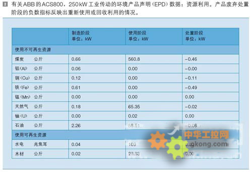 環境產品聲明(EPDs)以生命周期評估的信息(或結果)為基礎。環境產品聲明描述了產品在製造、使用和廢棄處置階段對環境所造成的最重要影響。這些數據經獨立第三方機構認證,具有可信度。ABB出具所有核心產品的環境產品聲明,包括變頻器,以及由環境產品聲明提供的與ABB的250kWACS800工業傳動相關的資源利用、能源消費和損失以及排放等方麵的信息,詳見圖2至圖4。