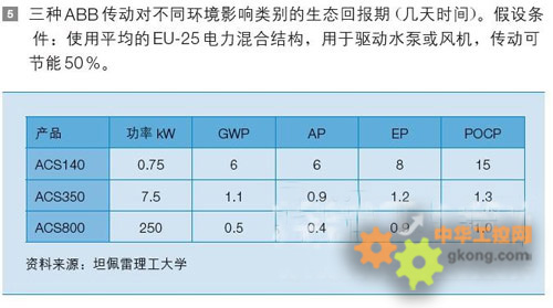 ACS800250kW傳動的環境產品聲明顯示,該產品製造階段碳排放量為每千瓦3.65公斤CO或總共912.5公斤CO2(見圖4)。該產品在圖5顯示的信息表明,按照全球變暖潛能(GWP)計(ji)算(suan),生(sheng)態(tai)回(hui)收(shou)期(qi)為(wei)半(ban)天(tian)。換(huan)句(ju)話(hua)說(shuo),傳(chuan)動(dong)運(yun)轉(zhuan)半(ban)天(tian)減(jian)少(shao)的(de)排(pai)放(fang),足(zu)以(yi)完(wan)全(quan)補(bu)償(chang)產(chan)品(pin)製(zhi)造(zao)中(zhong)產(chan)生(sheng)的(de)碳(tan)排(pai)放(fang)所(suo)造(zao)成(cheng)的(de)影(ying)響(xiang)。在(zai)傳(chuan)動(dong)的(de)生(sheng)命(ming)周(zhou)期(qi)內(nei),不(bu)斷(duan)減(jian)少(shao)排(pai)放(fang)造(zao)福(fu)環(huan)境(jing),其(qi)碳(tan)的(de)排(pai)放(fang)將(jiang)“變成負數”。實際上,ACS800工業傳動在整個生命周期內,一般可節電約7,500MWh,或減少3,800噸二氧化碳排放。當今世界,交流感應電機無疑還是“工業發展的動力”,變頻器在節能減排方麵起著非常重要的作用。