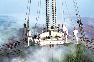 1981年,平武輸變電工程投運。圖為湖北超高壓輸變電公司員工在平武線所經漢江中山口大跨越鐵塔上進行檢修。
