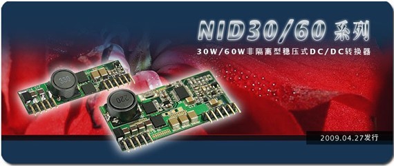NID30/60係列線路上采用Buck降壓式線路架構與運用了同步整流技術設計,使得轉換效率最高可達97%,故可僅利用自然風冷散熱工作於-25~65℃,並擁有69.6W/in3的超高功率密度,成功地將產品微型化(NID30尺寸50.8*13*10.7mm,NID60尺寸50.8*26*10.7mm)以達成最適化空間利用,可有效解決係統設計者基板布局空間不足的問題。NID30/60係列之輸入電壓範圍為20(30)~53V,涵蓋了係統DC BUS電壓常見的24V與48V,另輸出電壓為5V/12V/15V/24V,有別於一般POL(point of load) DC/DC轉換器產品常見的低電壓(<5VDC)輸出。其它的特點包含業界POL標準腳位、短路/過電壓/過負載保護、低漣波噪聲、低售價、體積小等,非常適用於分布式電源架構(distributed power architecture)、通訊產業、工業控製設備等相關應用。