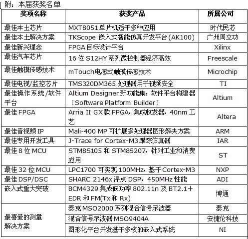 嵌入式係統編輯推薦獎是在中國計算機學會嵌入式係統專業委員會(微機專業委員會)、中國半導體行業協會集成電路設計分會和中國半導體行業協會嵌入式係統與應用工作委員會指導下,由中國科技核心期刊《電子產品世界》雜誌主辦的一年一度的國內頗具影響力的嵌入式技術評獎活動。該活動從每年5月開始麵向國內外企業征集最新嵌入式係統技術和產品,經過網絡展示、網絡投票和專家評審環節後,於每年9月最終揭曉,並於當年10月頒獎。嵌入式係統編輯推薦獎按技術分為10餘類分別評獎,同時單數年設嵌入式用戶最喜愛的測試測量解決方案獎,雙數年設立影響中國的嵌入式係統十佳企業獎。