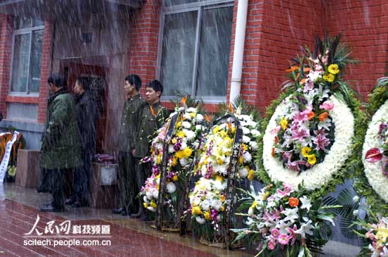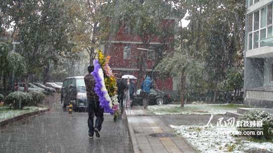 11月1日上午,錢學森先生生前寓所門前的花圈已積了厚厚一層雪。