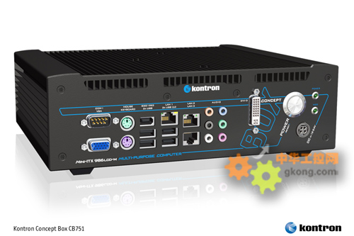 由於具備眾多接口,Kontron Concept Box 751 (75mm x 250mm x 260mm)的適用範圍非常廣泛。前端麵板有3 x LAN 10/100/1000, 4 x USB 2.0, 1 x IEEE1394, 1 x RS232, VGA, HD 音頻接口, PS/2鍵鼠接口。另外,還可通過ADD2擴展卡連接DVI接口。背部還有三個RS232和兩個USB接口。盒式PC核心部分是Mini-ITX Kontron 986LCD-M/mITX (BGA)主板,配備Intel® Celeron® 1.06 GHz 或 Intel® Core8482; Duo LV 1.66 GHz 處理器,最多 4 GB DDR2-RAM內存。數據存儲方麵,機箱內有2.5“ SATA硬盤塢,主板有一個CF插槽。此外還有一個PCIE擴展插槽。