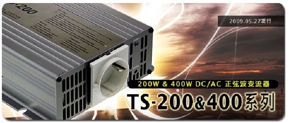 明緯新推出了TS-200(200W)及TS-400(400W)高性能直流/交流純正弦波變流器(DC/AC true sine wave inverter) 。此二係列的開發完成,搭配已推出的TS-700、TS-1000、TN/TS-1500係列,使得明緯正弦波變流器產品線已趨於完整,可提供200~1500W多樣化機種供不同瓦數需求之使用者選用。TS-200/400采高頻技術設計,大大減輕了產品重量與提高工作效率達88.5%。此二係列產品可持續提供200W(TS-200)/400W(TS-400)總諧波失真(THD)<3%的交流電源給各式嚴苛的負載類型使用,具備短時間供電230W(TS-200)/460W(TS-400)達3分鍾與300W(TS-200)/600W(TS-400)達10秒鍾的能力,並可承受瞬間2倍額定瓦數的尖峰負載達30個電源周期。