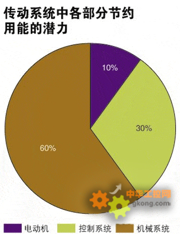 真zhen正zheng能neng產chan生sheng節jie能neng效xiao果guo的de是shi一yi個ge要yao大da得de多duo的de動dong作zuo,一yi個ge將jiang整zheng個ge傳chuan動dong係xi統tong考kao慮lv在zai內nei的de大da動dong作zuo。這zhe是shi因yin為wei,一yi個ge高gao能neng效xiao電dian動dong機ji即ji使shi在zai最zui佳jia運yun行xing狀zhuang態tai下xia,也ye隻zhi能neng減jian少shao10%的能耗量。因此,要想大幅度節約用能,更重要的是對可以節能30%的電子速度控製裝置和節能60%的優化機械係統的應用。