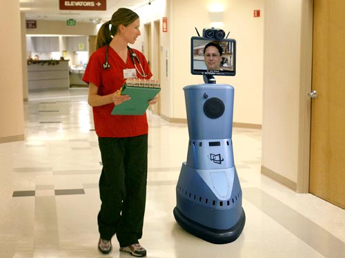 如圖所示,醫生正通過RP-7醫療機器人向護士詢問患者病情。這款機器人與聽診器、耳(er)鏡(jing)和(he)超(chao)聲(sheng)掃(sao)描(miao)儀(yi)相(xiang)連(lian)接(jie),還(hai)有(you)一(yi)個(ge)相(xiang)機(ji)和(he)一(yi)個(ge)屏(ping)幕(mu),使(shi)患(huan)者(zhe)和(he)遠(yuan)方(fang)的(de)醫(yi)生(sheng)都(dou)能(neng)看(kan)到(dao)對(dui)方(fang),從(cong)而(er)使(shi)醫(yi)生(sheng)可(ke)以(yi)最(zui)大(da)限(xian)度(du)地(di)像(xiang)親(qin)臨(lin)現(xian)場(chang)一(yi)樣(yang)進(jin)行(xing)診(zhen)療(liao)。