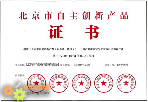 根據北京市政府《關於在中關村科技園區開展政府采購自主創新產品試點工作的意見》和《北京市自主創新產品認定辦法(修訂)》的規定,經組織專家評審,市科委、市發展改革委、市建委、市工促局、中關村管委會認定,北京研祥基於EVOC-EPI規範的4U工控機獲得《北京市自主創新產品證書》,並入選北京市自主創新產品目錄,進一步彰顯了北京研祥的自主創新能力。