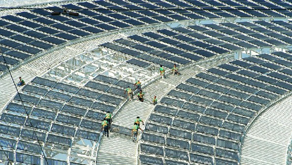 圖為建築工人正在屋頂安裝太陽能板。該建築是2010年第四屆世界太陽城大會的主會場。其屋麵、外牆采用了遠遠高於國家現行標準厚度的聚苯保溫板,整體傳熱係數大大降低,比節能標準低30%左右;尤其是門窗、天窗和幕牆,采用了溫屏節能玻璃和BIPV溫屏光伏組件,傳熱係數降低為國家節能標準的一半