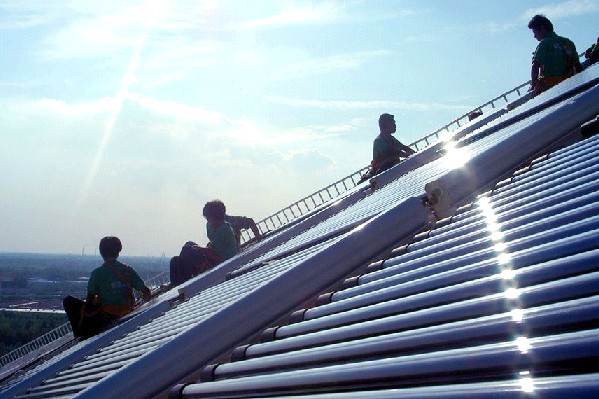 2008年8月2日,太陽能安裝工人在“日月壇·微排大廈”上,安裝太陽能電池板與集熱器。
