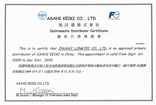 經過對長陸公司的考察,日本富士電機集團下屬的ASAHI KEIKI旭計器株式會社於近日正式授權我公司為中國大陸地區的總代理。