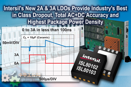 美國加州、MILPITAS — 2009年12月22日 — 全球高性能模擬半導體設計和製造領導廠商Intersil公司(納斯達克全球精選市場交易代碼:ISIL)今天宣布,推出ISL80102和ISL80103。這兩款低電壓、大電流、低壓降線性穩壓器(LDO)可分別提供2A和3A輸出電流。當市場上大多數LDO還在采用十幾年前的陳舊技術時,這些新器件則使用了最先進的BiCOMS技術,使性能達到了全新的水平。這些新款LDO具有業內最快的瞬態響應,可確保在負載電流不斷變化時恰當地調節輸出電壓。這些器件在3A和2A輸出電流時還具有120mV和81mV的超低壓降。
