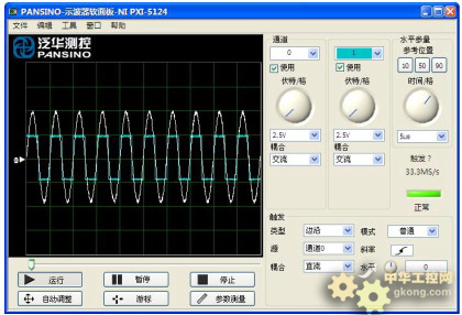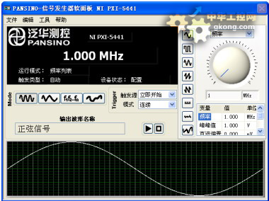 示波器軟麵板可適用於多種高速數字化儀板卡,如NI-PXI、NI-PCI及NI-PXIe等,不僅可以實現對示波器板卡的參數設置、采集控製,還可進行參數測量等功能。信號發生器軟麵板則適用於NI-PXI係列的多種信號發生器設備,可實現對FGEN設備的標準信號(如:正弦信號、方波信號、鋸齒波信號等)、掃頻信號、任意波形、頻移鍵控信號和頻率列表信號的輸出,可提供包括模式選擇、觸發配置、函數選擇、參數配置、單位配置等功能。直流電源軟麵板可實現對直流電源板卡的參數進行配置及測量,可實現包括直流電源板卡類型、輸出功能、輸出幅值、輸出限製、啟用使能等在內的參數配置。