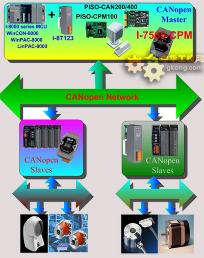 泓格公司的I-7565-CPM產品不僅能讓用戶簡單的控製CANopen Slave的設備,而且也能更快速,穩定的建立起CANopen係統,減少係統開發的時間。下圖展示了典型的CANopen應用架構。