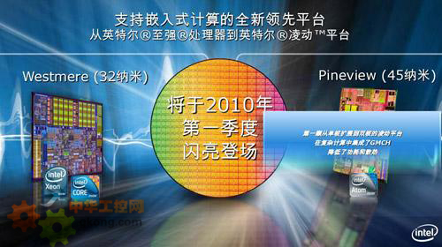 在體積2010年規劃時,Douglas略顯興奮地表示,2010年,英特爾會發布嵌入式計算的全新領先平台,采用32納米製程工藝Westmere處理器也將支持嵌入式的應用。另外,在淩動處理器的路線圖上,下一代處理器Pineview也會是英特爾嵌入式家族的一員。