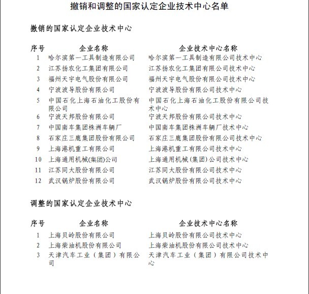 撤銷和調整的國家認定企業技術中心名單