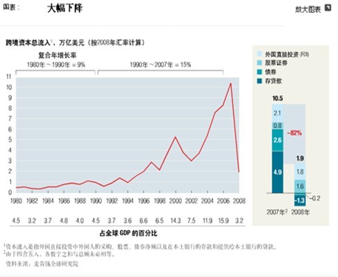 全球金融危機以及世界範圍的衰退,讓持續擴張了近30年的國際資本市場突然停滯下來。從1980年到2007年,包括股票、私人及公共債券以及銀行存款在內的世界金融資產相當於全球GDP的比例翻了近兩番。其間,全球資本流也同樣洶湧澎湃。