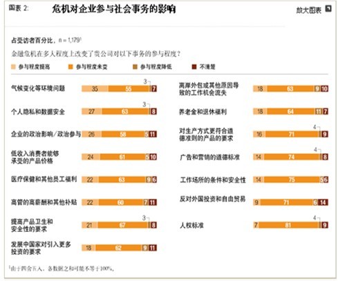 金jin融rong危wei機ji提ti高gao了le公gong眾zhong對dui企qi業ye社she會hui角jiao色se的de期qi望wang。大da多duo數shu公gong司si都dou保bao持chi或huo增zeng加jia了le應ying對dui社she會hui政zheng治zhi問wen題ti方fang麵mian的de投tou入ru,並bing且qie已yi有you許xu多duo公gong司si從cong中zhong獲huo得de了le超chao出chu預yu期qi的de收shou益yi。