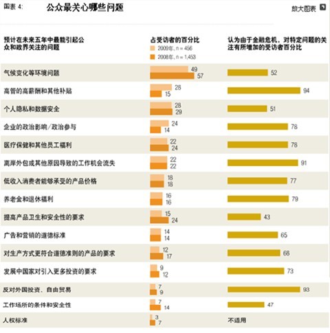 事實上,在高管們認為最受公眾關注的問題中,高管薪酬從2007年和2008年的第八位迅速竄升至第二位,而正是這個問題嚴重削弱了公眾對企業的信任3。此外,雖然環境問題繼續保持在第一位,但選擇這個問題的高管比例從2008年的57%下降到今年的49%4。